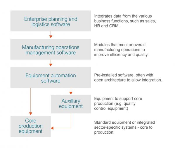 Auxiliary equipment: this includes equipment used to automate non-core production processes, such as beginning of the line and end of the line material handling, packaging, inspection and ancillary input processing. The equipment and its software are often critical for maintaining production and can lead to upselling opportunities. For example, vision inspection equipment and software for manufacturing quality control are often sold with additional machinery for bad part rejection and sorting.